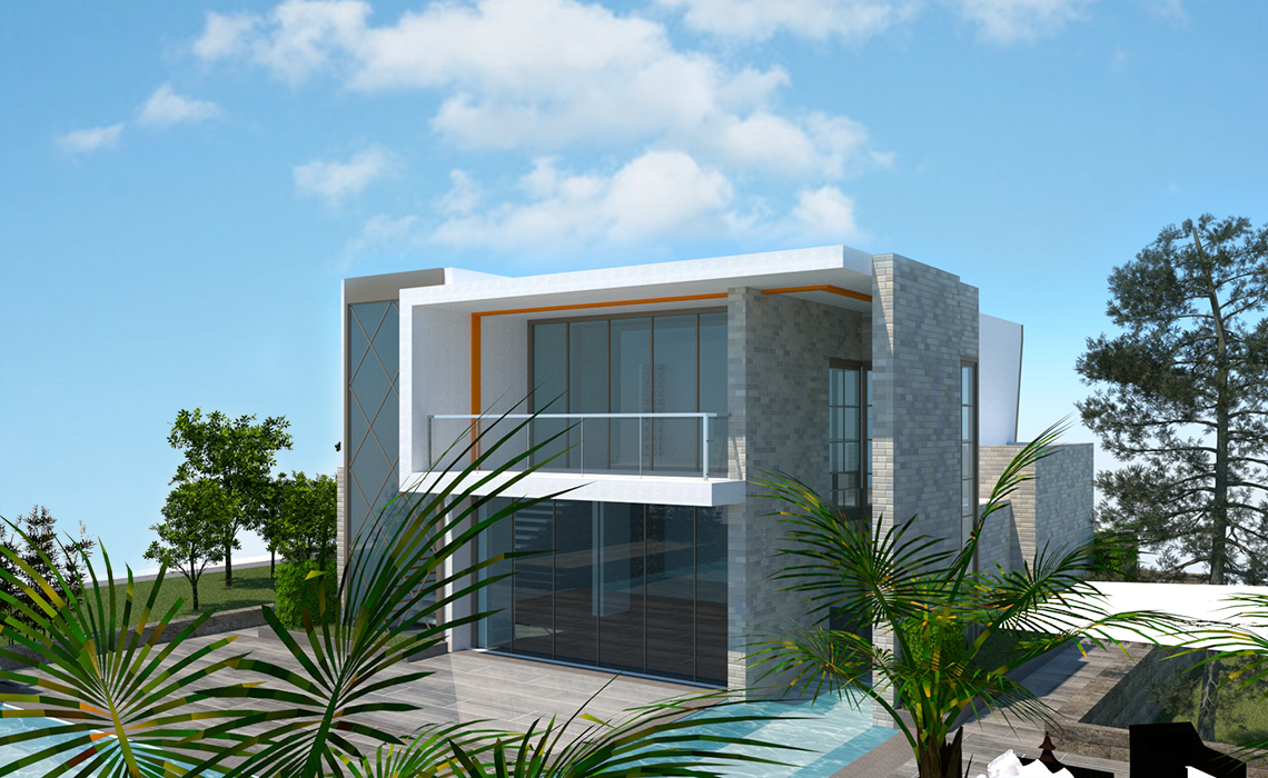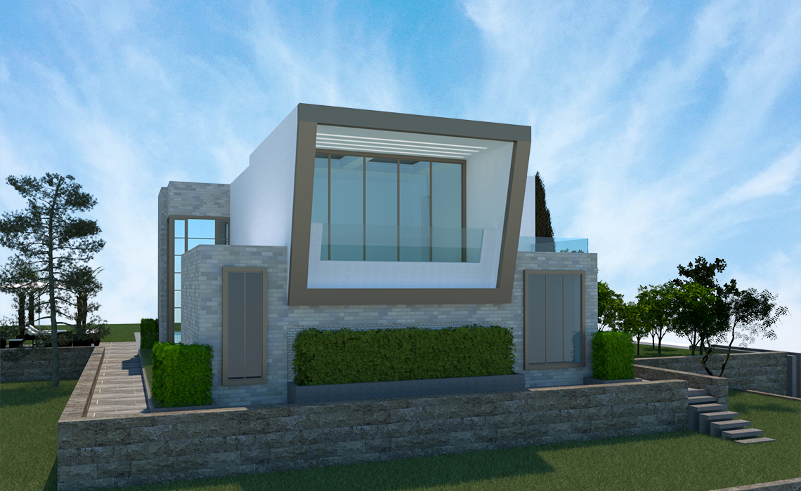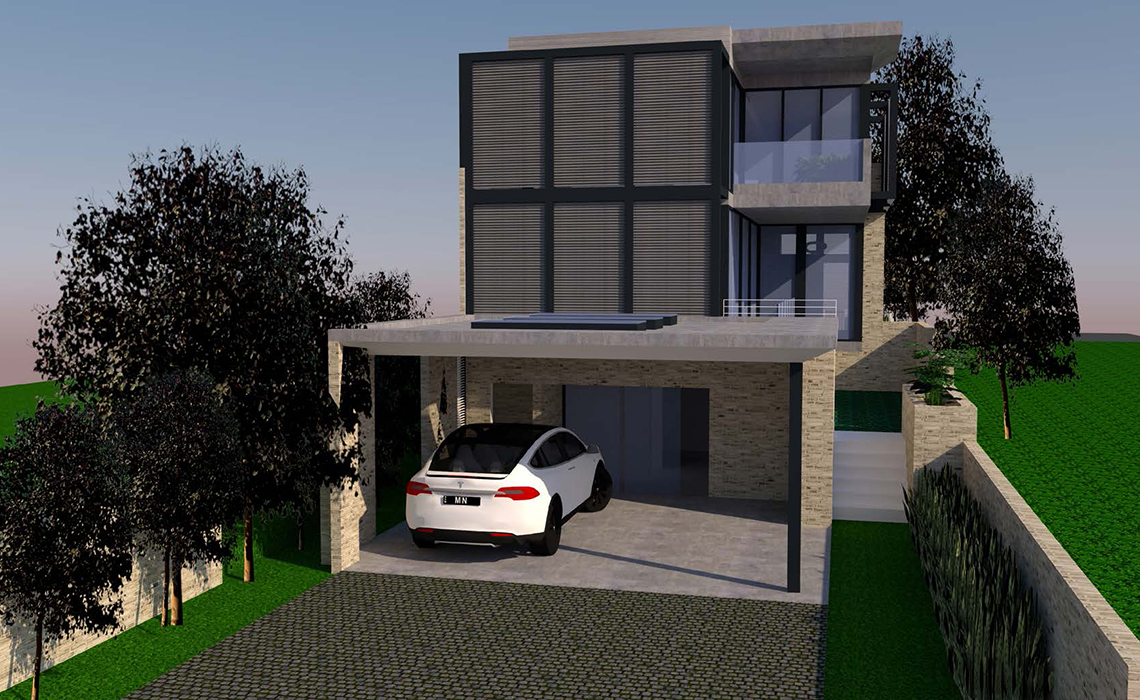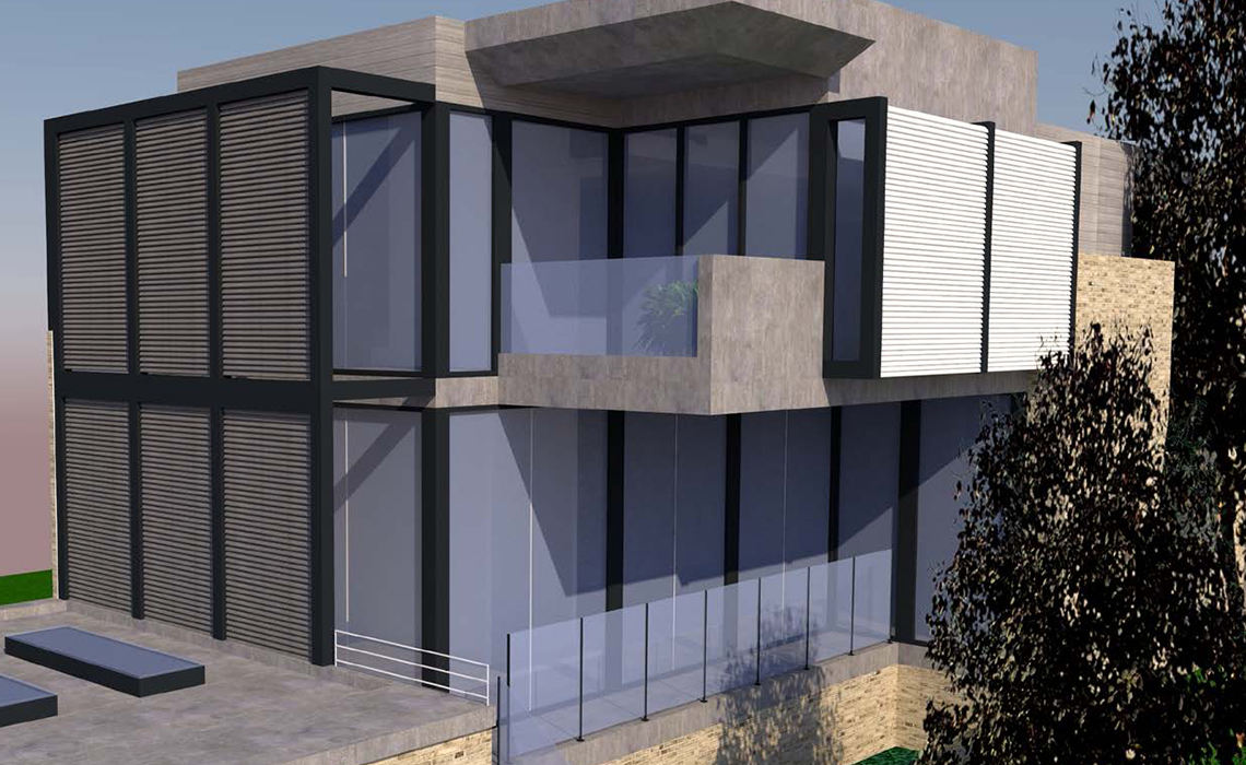 La Villa si trova su di un’area collinare e si affaccia su Canada Bay aprendo la sua living area sulla baia con un design architettonico che ne sfrutta e valorizza la vista trovandosi al livello superiore, mentre l’ingresso principale dell’edificio è più austero trovandosi sulla parte prospiciente la strada. Gli esterni si compongono di un giardino architettonico studiato per ospitare certe tipologie di piante e la pavimentazione è composta con lastre in pietra. L’illuminazione è concepita per valorizzare le forme architettoniche senza illuminare troppo gli interni.