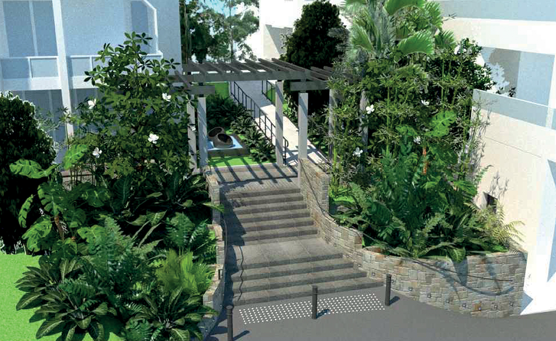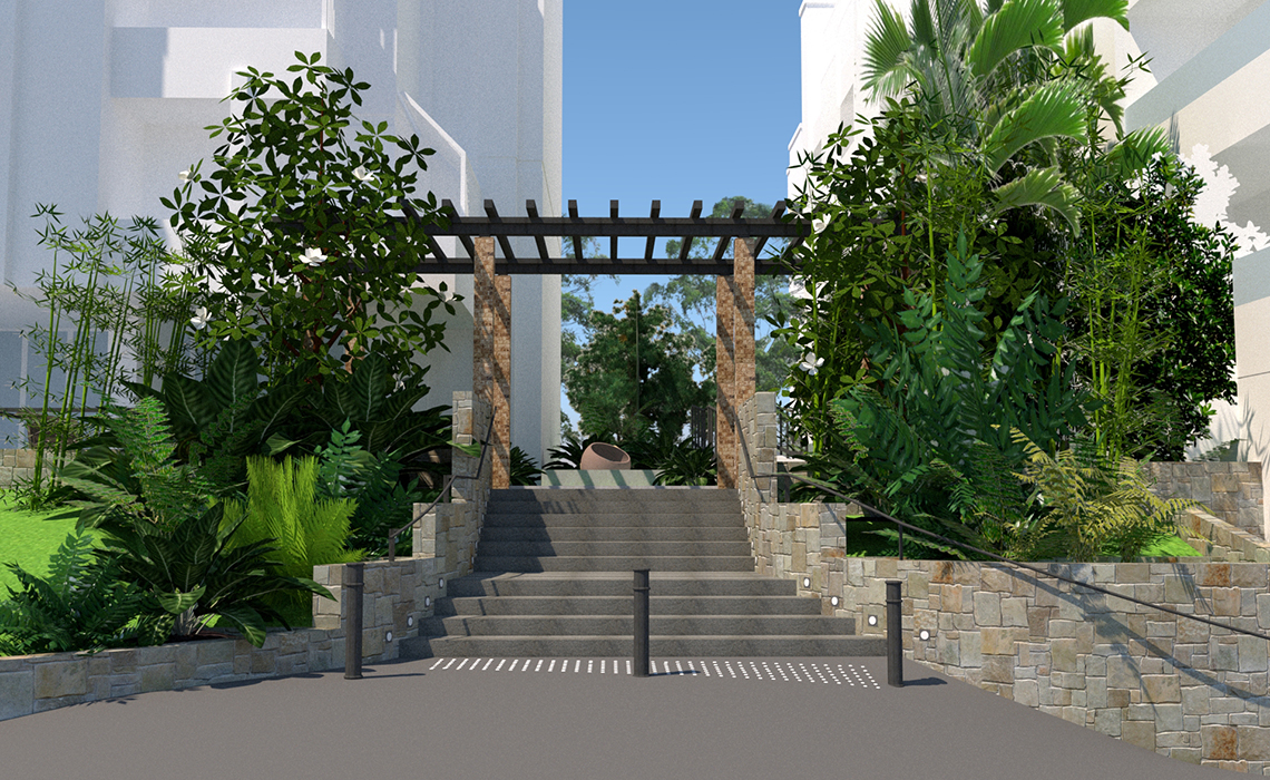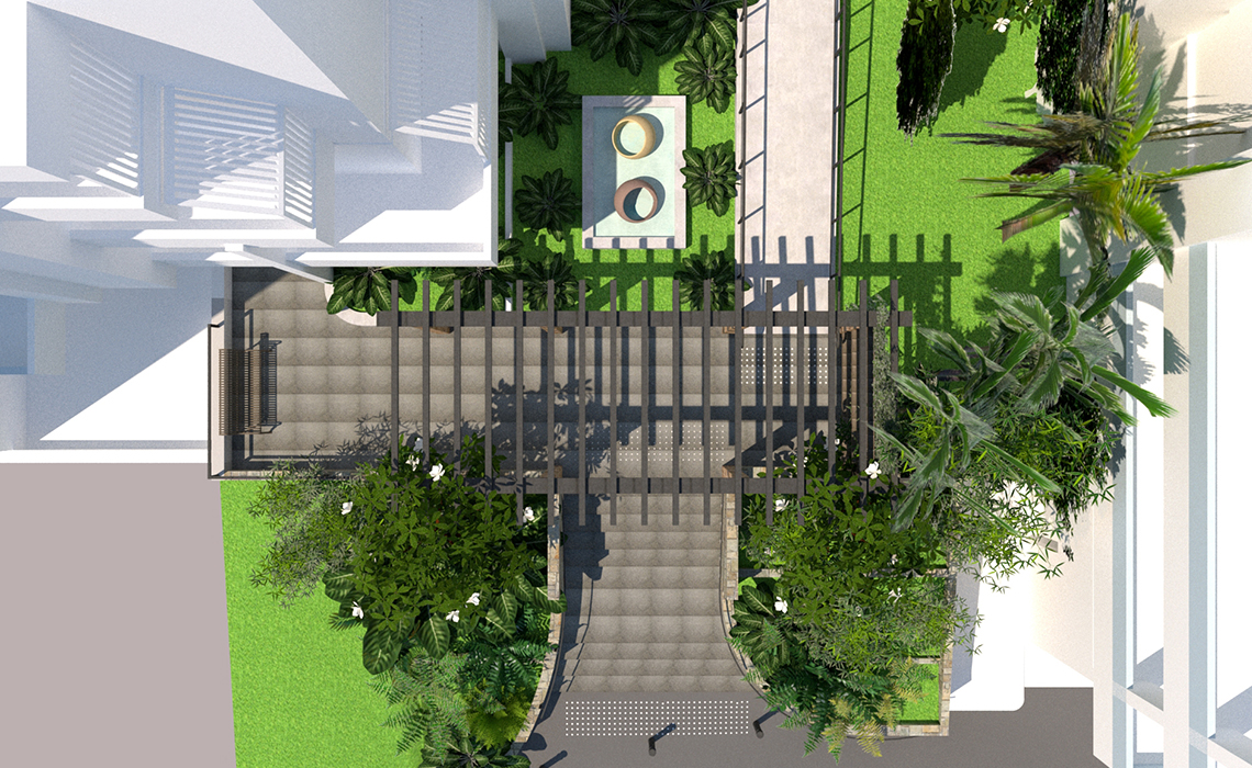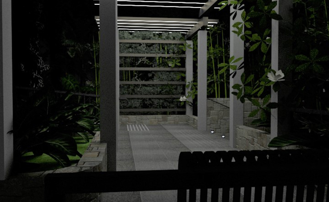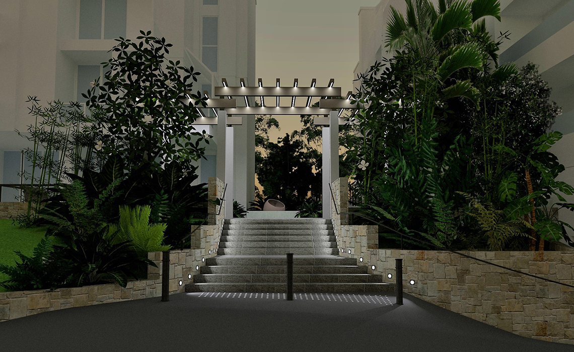 Riqualificazione degli accessi all’edificio residenziale con uno studio del giardino e delle essenze autoctone esistenti e illuminazione esterna.